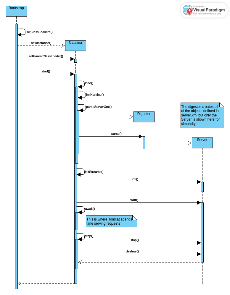 The UML sequence diagram of the startup procedure created for Tomcat 5 is gradually being replaced with updated diagrams based on Tomcat 11. The scope of these diagrams may be adjusted as they are produced.